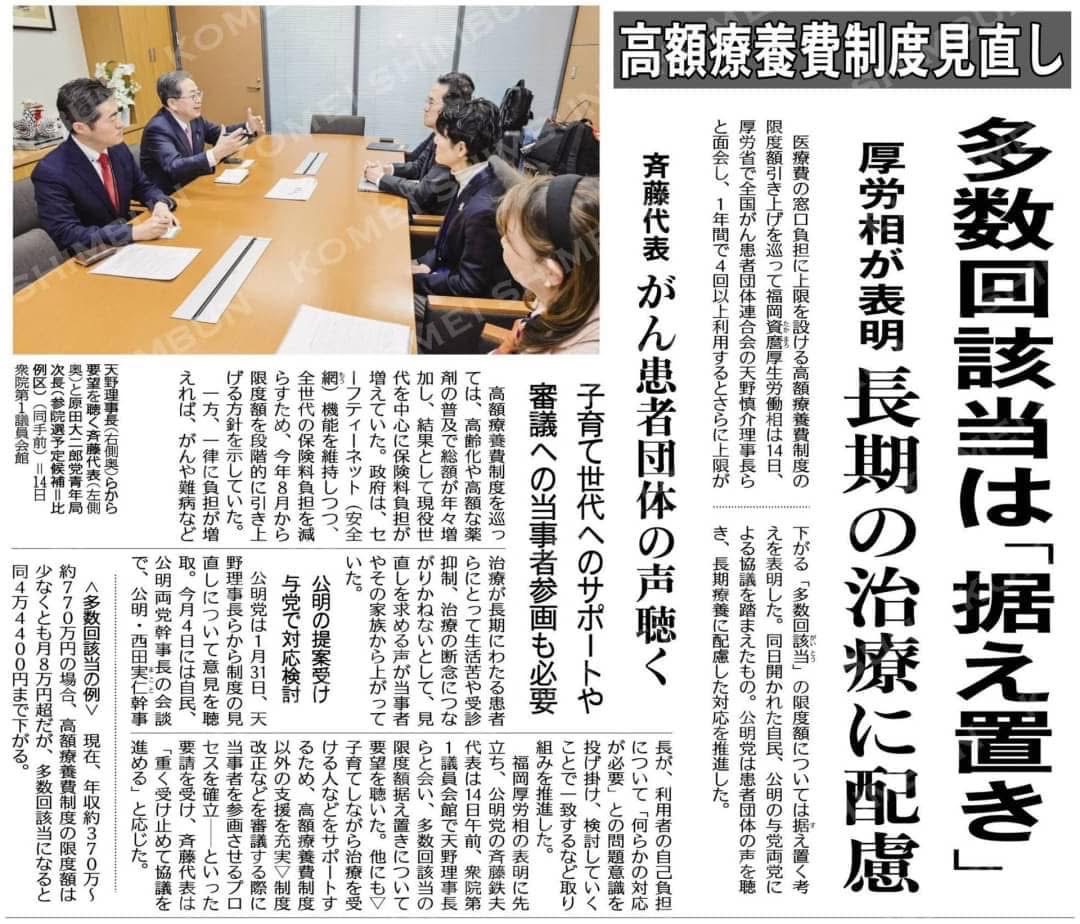 公明党の主張が盛り込まれました‼️ (高額療養費制度見直し)多数回該当は「据え置き」/厚労相が表明、長期の治療に配慮/斉藤代表、がん患者団体の声聴く #公明新聞電子版 2025年02月15日付