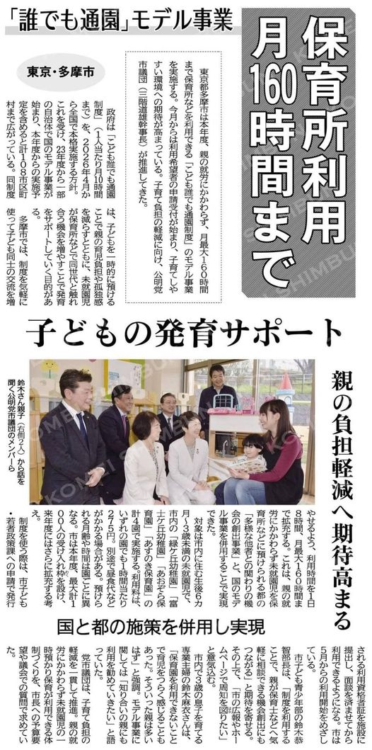 保育所利用、月160時間まで/「誰でも通園」モデル事業/東京・多摩市 #公明新聞電子版 2024年04月25日付八尾市においては2026年4月の本格実施を目指して「誰でも通園制度」を構築してまいります…
