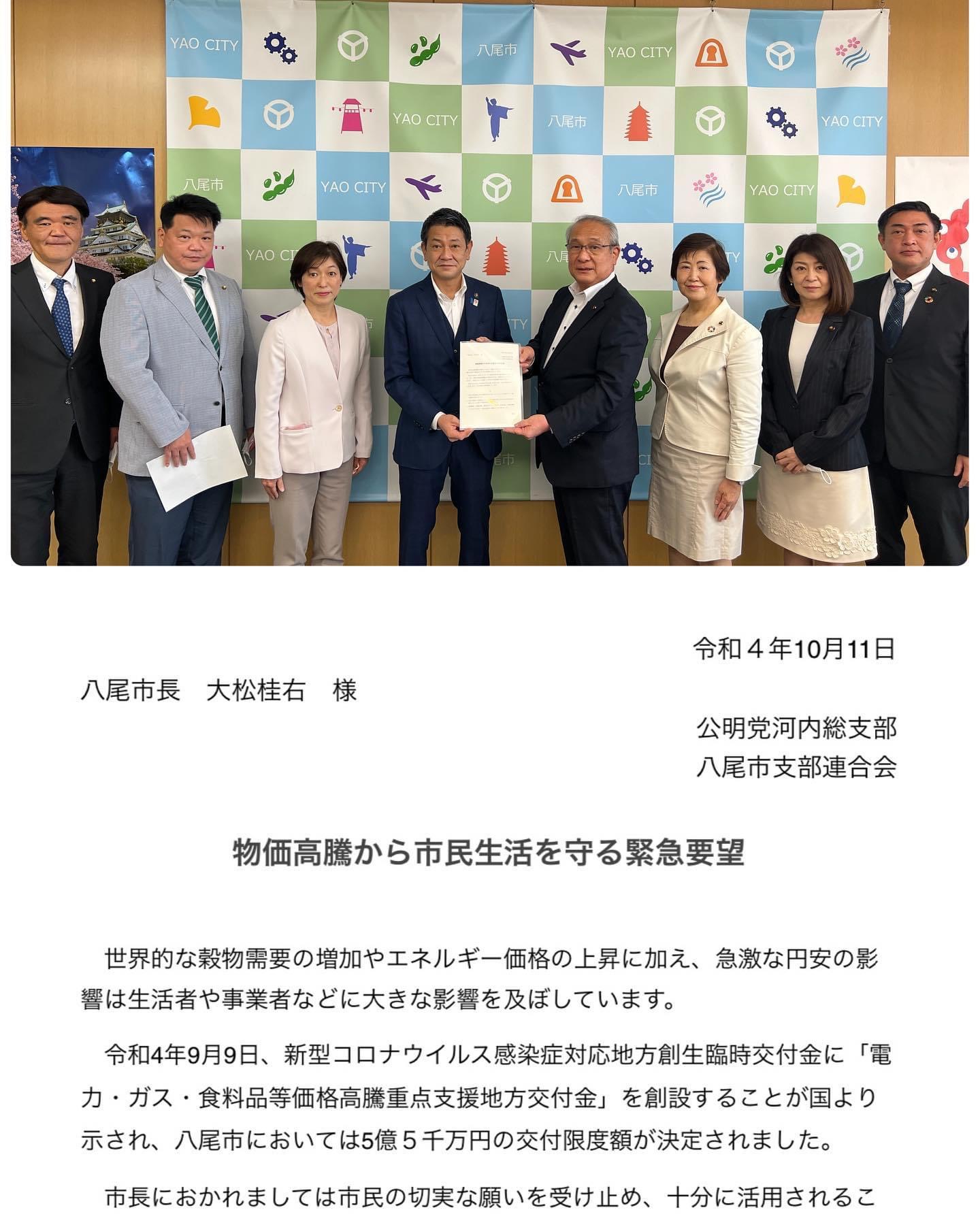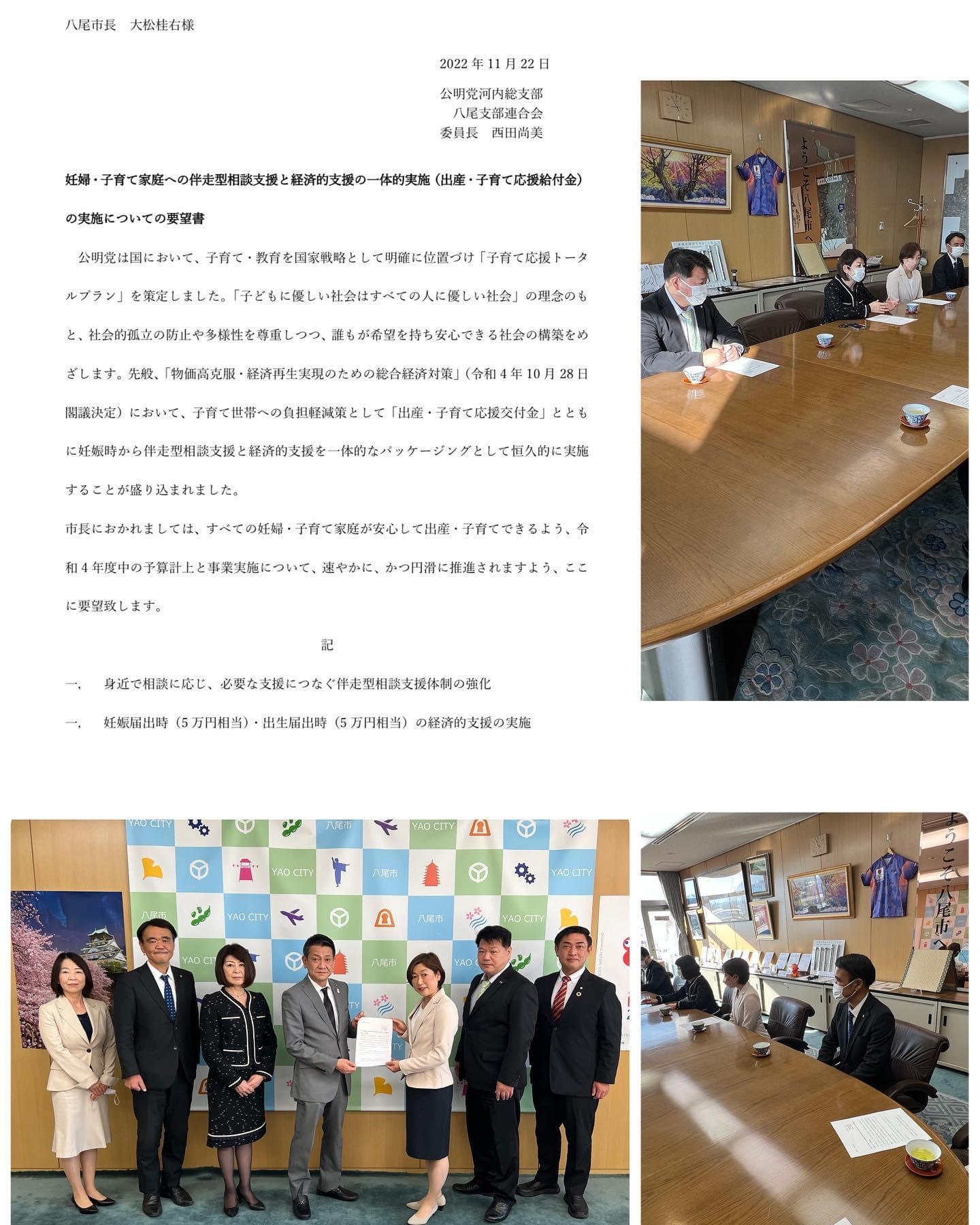 本日ほり川裕子八尾市府政策委員長中心に公明党八尾支部連合会として妊婦・子育て家庭への伴走型相談支援と経済的支援の一体的実施(出産・子育て応援給付金)について市長に要望書を提出しました。公明党は国・府・…